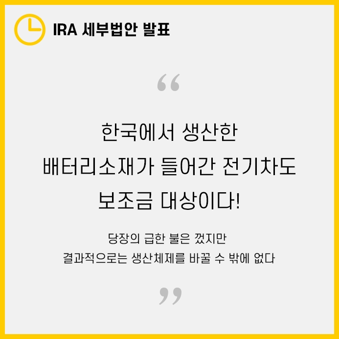 이전 IRA법안만 보았을 때는 한국 배터리 기업에게 불리한 내용들이 굉장히 많았는데 이 부분에서 한시름 놓을 수 있었습니다.