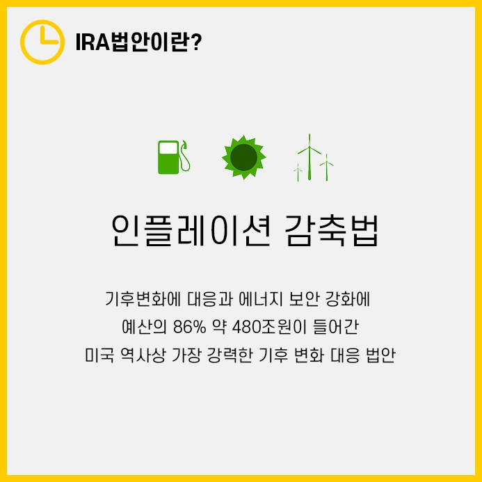 IRA 법안은 '인플레이션 감축법'으로 기후변화에 대응하는데 예산의 86%가 들어간만큼 미국역사상 가장 강력한 기후변화 대응 법안이라는 평을 받았습니다.