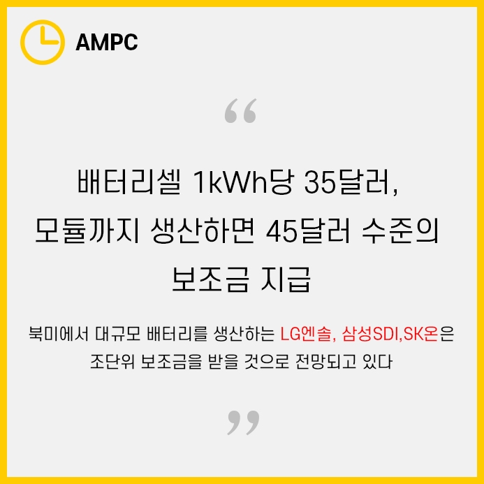 AMPC란 '첨단 제조 생산세액공제'로 배터리 1kWh당 35달러, 모듈까지 생산 시 45달러의 보조금을 지원받는 것입니다.