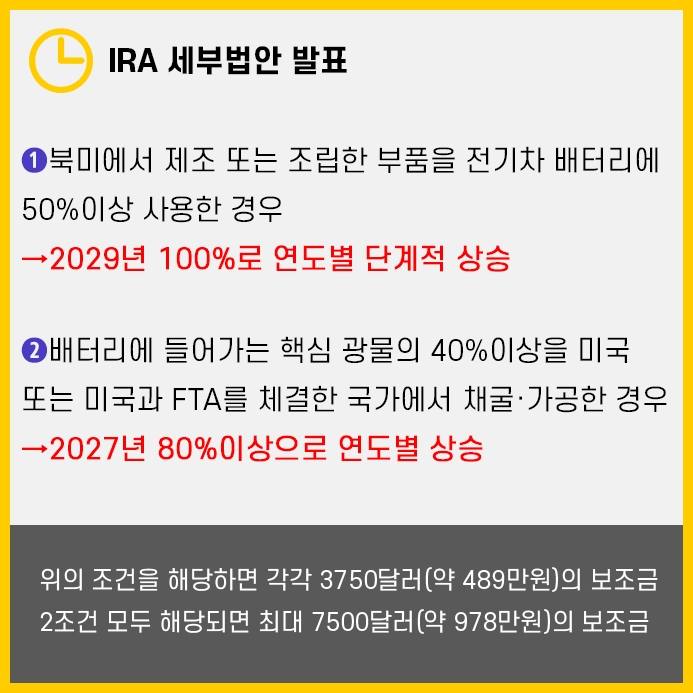 1. 북미에서 제조하거나 조립한 부품을 전기차 배터리에 50%이상 사용해야 한다 (*2029년 100%로 연도별 단계적 상승)