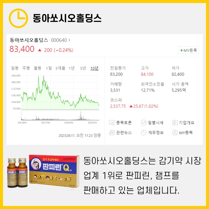 동아쏘시오홀딩스는 국내 1위 감기약 업체로 판피린과 챔프라는 대표상품을 보유하고 있습니다.