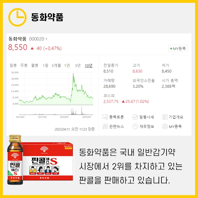 국내 감기약 시장에서 2위를 차지하고 있는 판콜을 개발한 회사입니다.