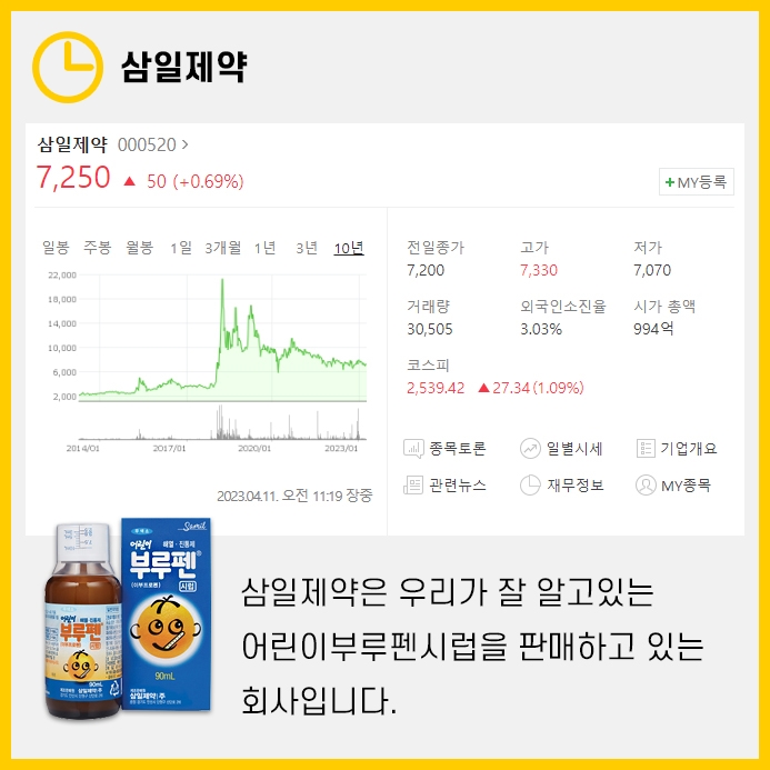 삼일제약은 추억의 감기약인 어린이부루펜시럽을 보유하고 있는 회사입니다.