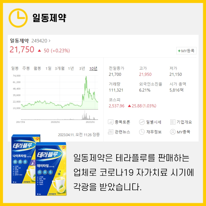 일동제약은 테라플루를 개발한 업체로 2022년 코로나19 유행시기에 한달간 주가가 41.1%나 상승했던 종목입니다.