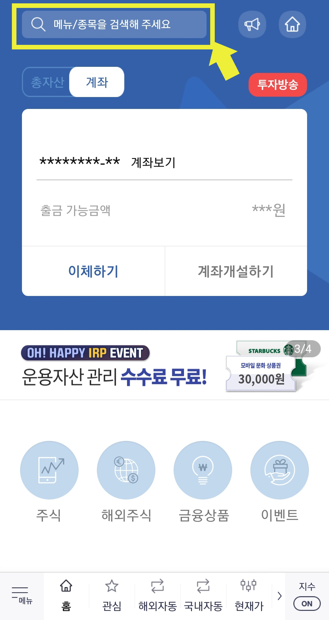 어플 홈의 상단에 메뉴를 검색창을