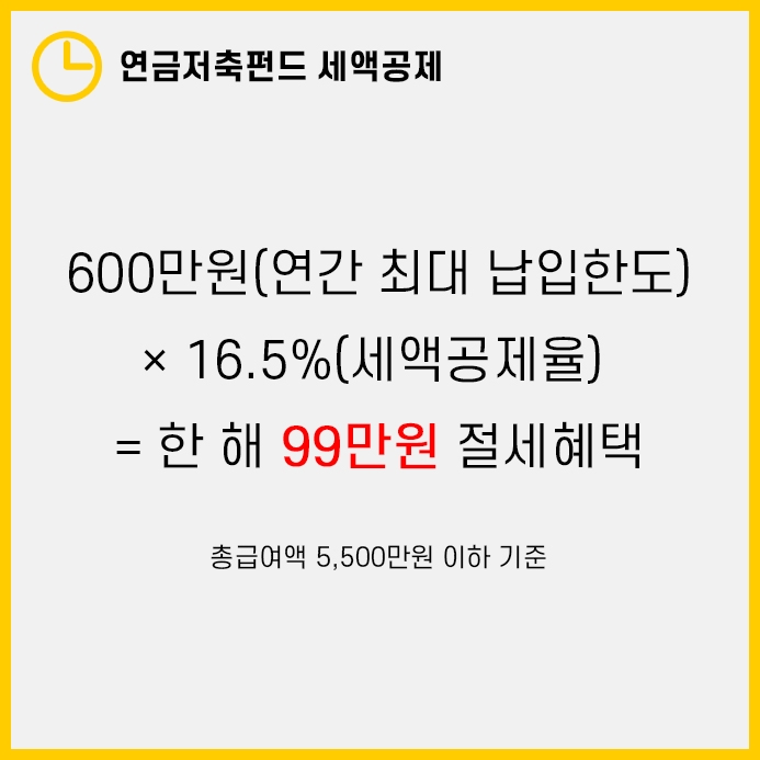 600만원 (연간 최대 납입한도) × 16.5%(세액공제율) = 99만원