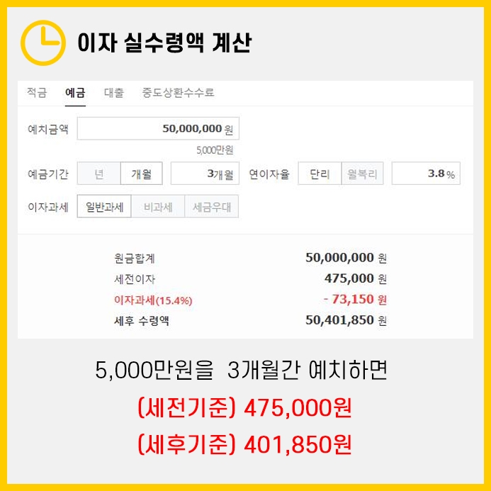 5,000만원을 3개월간 예치했다면 (세전기준) 475,000원 / (세후기준) 401,850원이 됩니다.