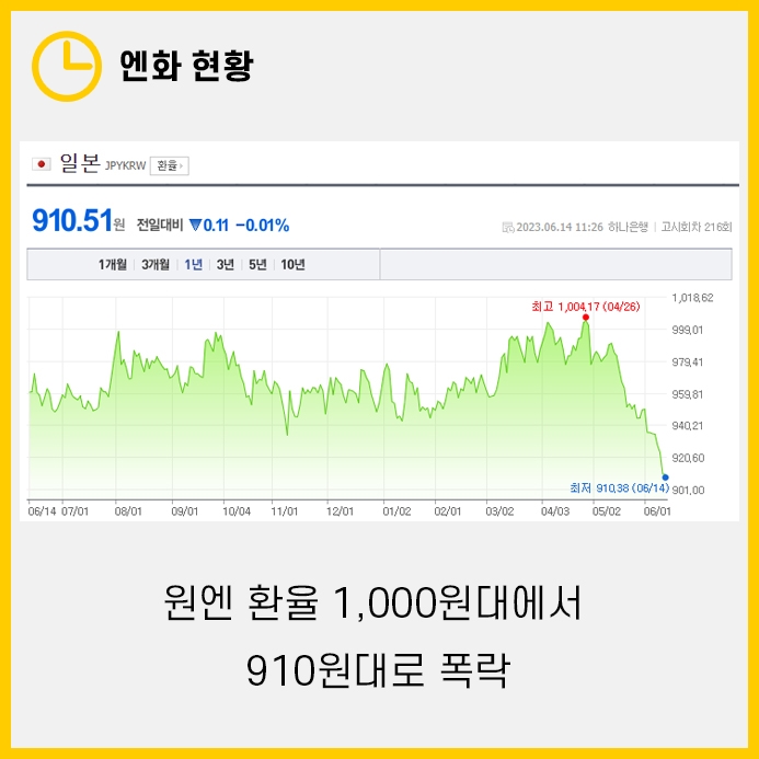 6월 14일 기준 원엔환율은 910원을 기록했습니다.