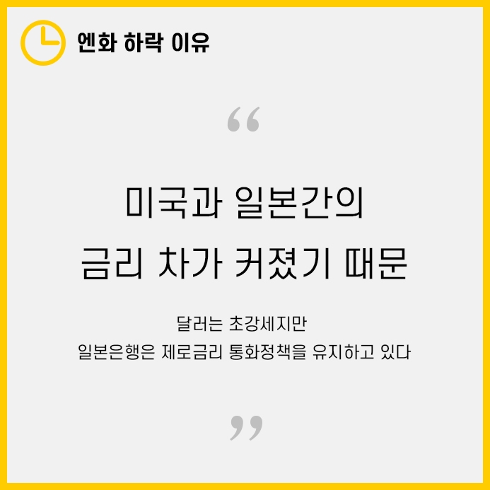 달러와 원화는 계속된 금리인상으로 인해 화폐 가치가 높아졌지만, 엔화는 금리완화정책을 고수하고 있어 엔화 가치가 절하된 것입니다.