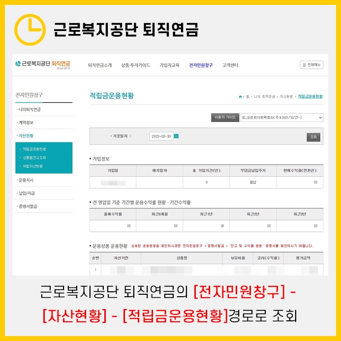 근로복지공단 퇴직연금 홈페이지에서 [전자민원창구] - [자산현황] - [저립금운용현황] 메뉴를 클릭해서 조회할 수 있습니다.
