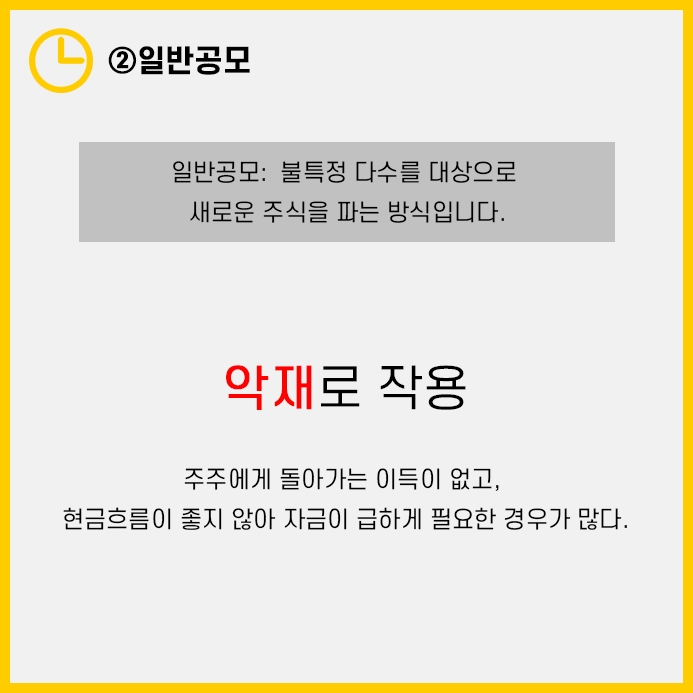 일반공모의 경우엔 현금 흐름이 좋지 않아 불특정다수에게 급하게 자금을 마련해야 하는 상황으로 해석할 수 있습니다.