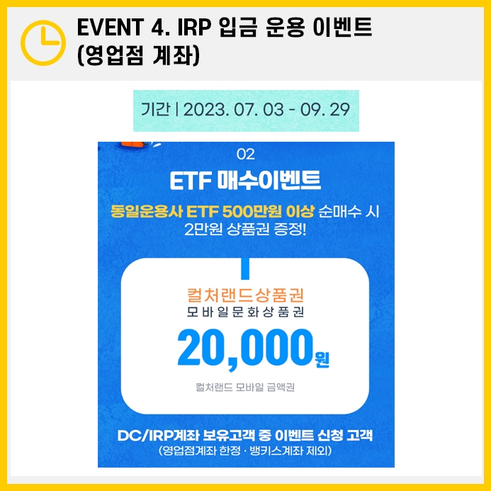 동일 운용사의 ETF를 퇴직연금 계좌에서 500만원 이상 순매수를 할경우 20,000원의 컬처랜드 상품권을 받을 수 있습니다.