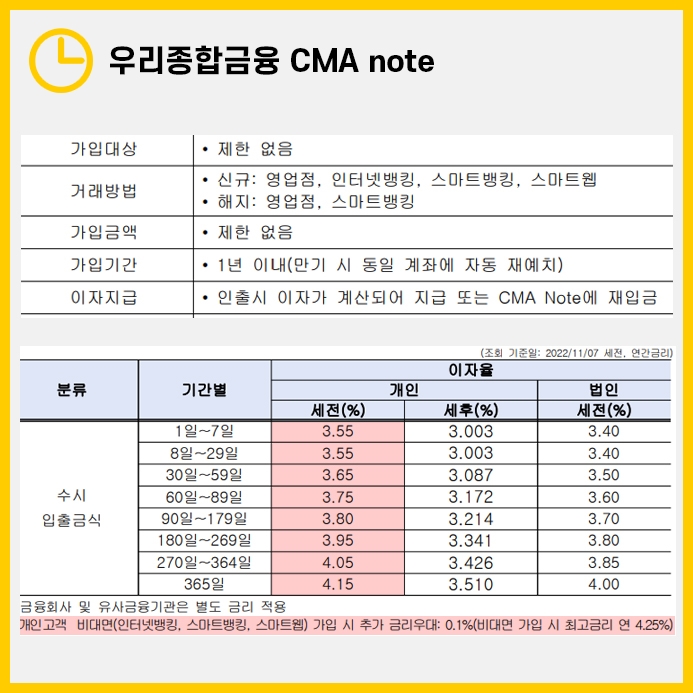우리종합금융 CMA note는 타 입출금통장대비 높은 금리를 제공합니다.