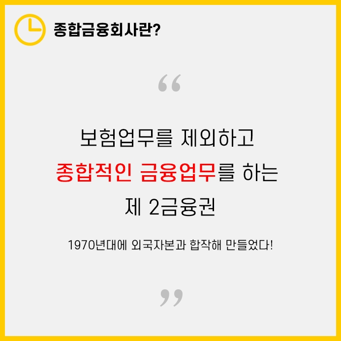이러한 종합금융회사는 1970년대 한국이 경제개발을 하면서 적극적인 외자도입을 위해 외국자본과 합작하여 만들어진 것입니다.