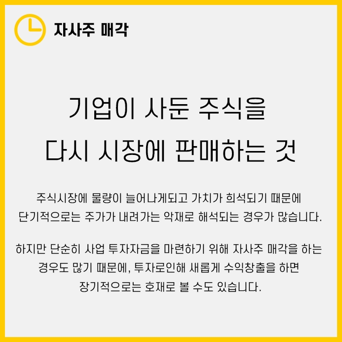 하지만 사업 투자 자금을 마련하기 위해 매각을 하는 경우도 있기 때문에 자사주 매각 배경까지 고려해서 해석할 필요가 있습니다.
