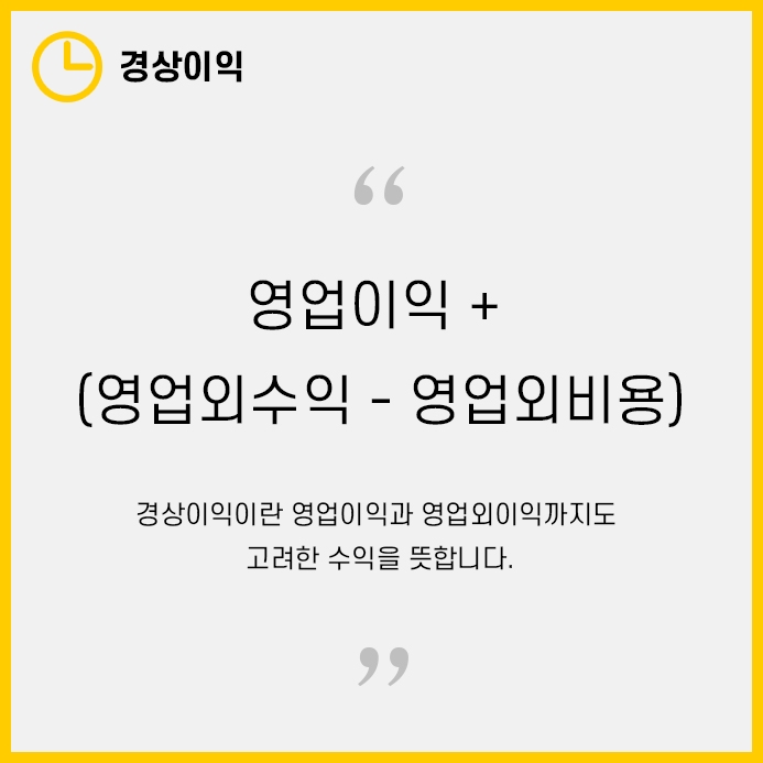 경상이익은 '영업이익+(영업외수익-영업외비용)'으로, 회사의 주된 영업외에도 벌어들인 수익까지 포함한 수익입니다.