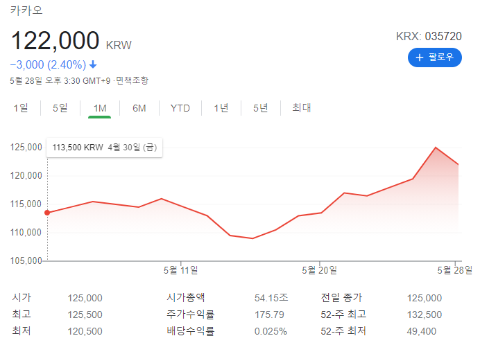 5월에 109,000원까지 떨어진 카카오가