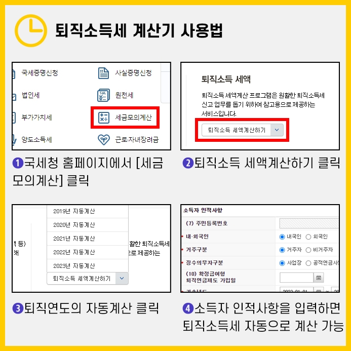 먼저 국세청 홈페이지에 접속해 [세금 모의계산] - [퇴직소득 세액계산하기]를 클릭해, 본인이 퇴직한 연도 및 본인의 인적사항 등을 입력하면 간편하게 모의계산을 할 수 있습니다.