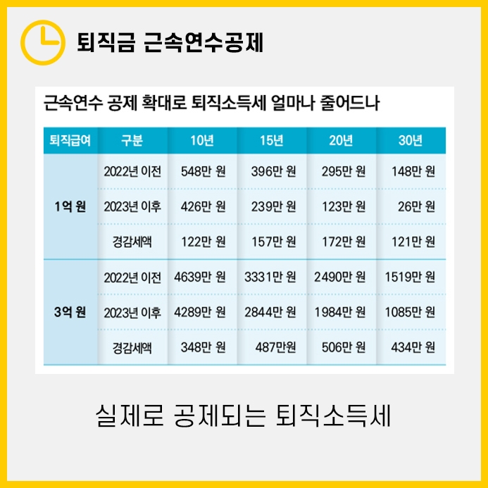 하지만 2023년부터는 '100만원×근속연수'를 공제받아 한해당 70만원씩을 더 많이 공제받게 됩니다.