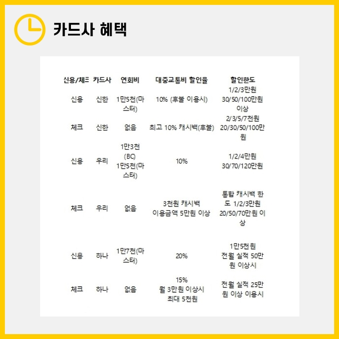 대중교통비 할인율, 전월실적 등 상세한 내용들이 다르다보니 본인에게 유리한 혜택이 있는 금융사를 선택하시기 바랍니다.