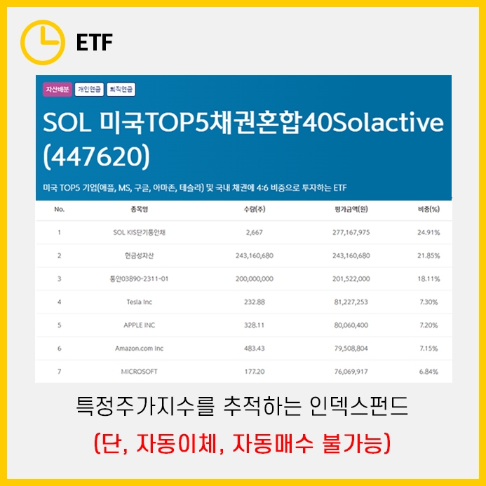 이는 주식과 같이 거래소에서 쉽게 매매할 수 있는 투자 상품으로, 일반적으로 지수를 기반으로 운용됩니다. 따라서 평소에 주식 거래에 익숙한 분들이라면 ETF를 편하게 거래할 수 있겠습니다. ETF는 여러 종목으로 구성된 포트폴리오를 추적하므로 분산 투자를 통해 투자 위험을 낮출 수 있습니다.