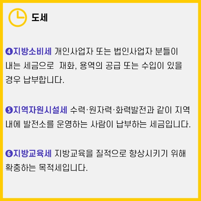 경기도, 충처도 등의 '도'의 운영에 전반적으로 필요한 예산을 충당하기위해 걷는 세금입니다. 그 종류로는 크게 6가지가 있습니다.
