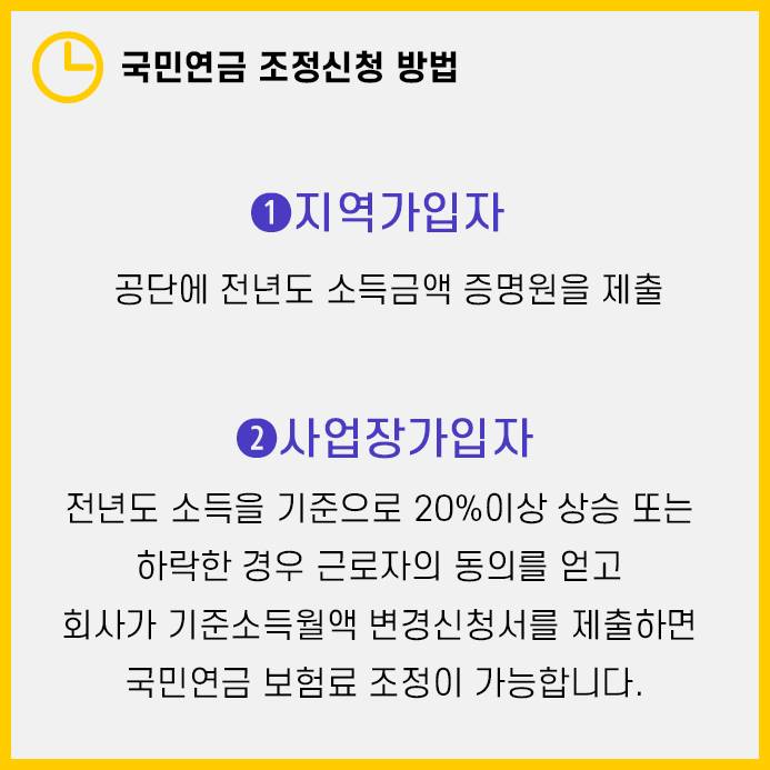 연금액을 납부하는 시점의 월소득이 전년대비 20%이상 하락했거나 상승한 경우에 신청할 수 있습니다. 이 때 근로자의 동의를 얻어서 최종신청은 사용자가 하게됩니다.