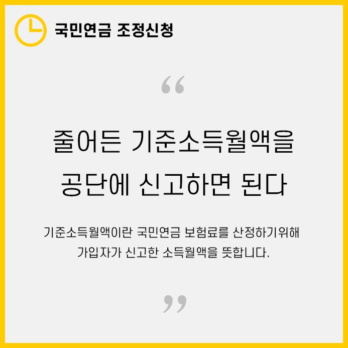이럴때 소득이 줄은 연금 가입자를 대상으로 시행하는 국민연금 조정신청 제도를 활용하면 좋습니다.