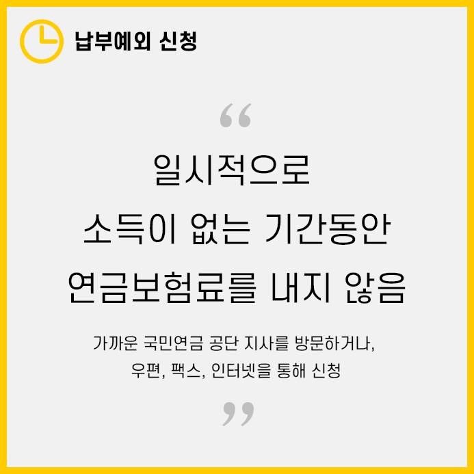 실직, 휴직, 사업중단으로 인해 소득이 없거나 줄어든 경우엔 납부예외를 신청할 수 있습니다. 즉, 일정기간동안 납부액을 내지 않을 수 있습니다.