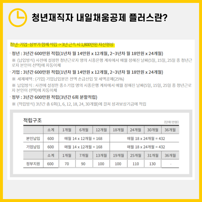 청년근로자는 3년만기로 600만원을 납부하게됩니다. 기업과 정부는 3년간 600만원씩 적립합니다. 이렇게 최대 1,800만원의 자산을 형성할 수 있습니다.