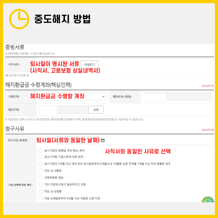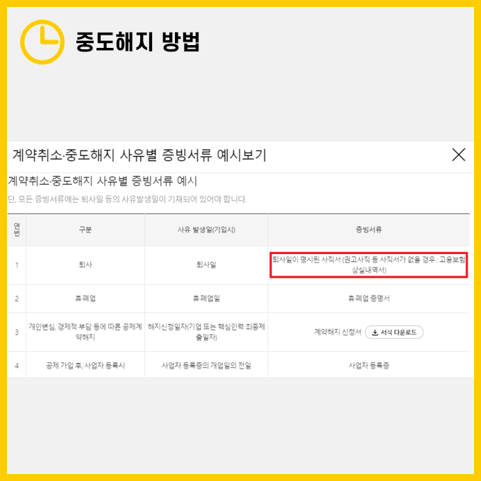 이렇게 본인의 해지 유형에 따라 증빙서류를 첨부해줍니다.