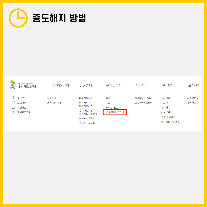 내일채움공제 홈페이지에 접속해 메뉴에서 [온라인신청] - [변경, 해지 및 만기]를 선택합니다.