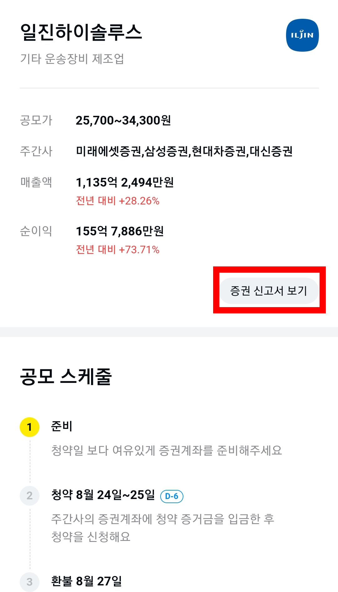 이렇게 디데이로 일정을 확인할 수 있고, 공모주 이름을 터치한 뒤 증권 신고서까지 눌러주면 자세한 공모 정보까지 알 수 있었습니다.