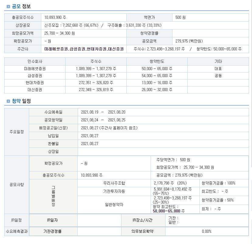 공모주 이름을 선택하면 다음같이 공모 정보로 넘어갑니다. DART에서 일일이 정보를 다 찾으려면 오래걸리는데 이렇게 보기쉽게 되어있으니까 딱 필요한 정보만 얻을 수 있어 좋았습니다.