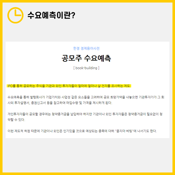 IPO가 상장되기 전에는 기관투자자가 대표주관회사에 매입희망수량과 가격을 제시합니다. 이를 '수요예측'이라고 합니다. 수요예측을 통해 투자자들이 얼마나 많은 주식을 구매하고자 하는지, 이에 따라 어떠한 경쟁이 예상되는지 등을 평가하는 데 도움이 될 수 있습니다.