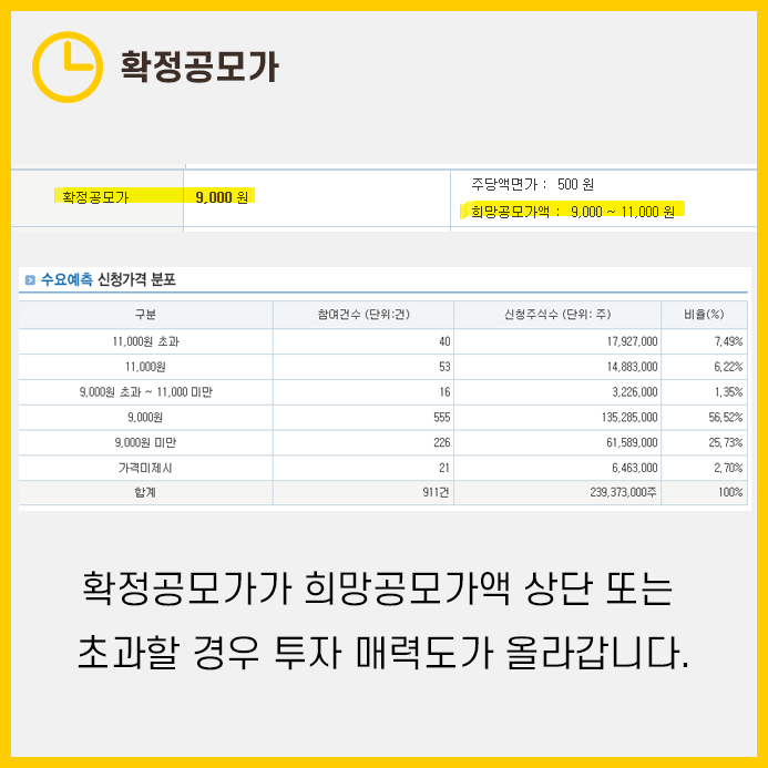 이를 바탕으로 발행회사, 대표주관회사의 협의에 따라 확정공모가가 결정됩니다. 확정공모가가 희망공모가액 상단, 또는 초과할 경우 투자 매력도가 올라갑니다.