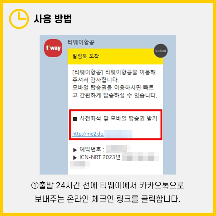 이용방법도 굉장히 간단합니다. 출발 24시간 전이 되면 티웨이로부터 카카오톡 알림을 받게됩니다. 여기에 있는 URL을 클릭하게되면 모바일 탑승권을 받을 수 있습니다.