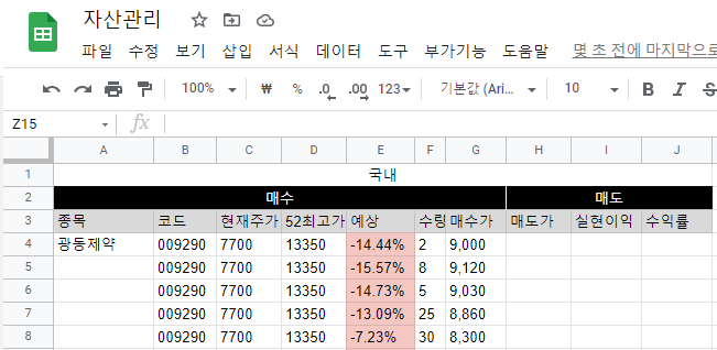 기본적인 인터페이스는 엑셀과 거의 같습니다만, 구글 스프레드의 최고 장점은 인터넷으로 연동된다는 점입니다. 수식을 이용하면 엑셀에 그날의 달러정보, 52일 최고가, 현재가 등을 바로바로 볼 수 있습니다. 귀찮게 매번 입력하지 않아도 똘똘하게 값을 수정해주니 굉장히 편리합니다. 구글 스프레드를 쓰면서 정말 세상이 좋아졌음을 느꼈습니다.