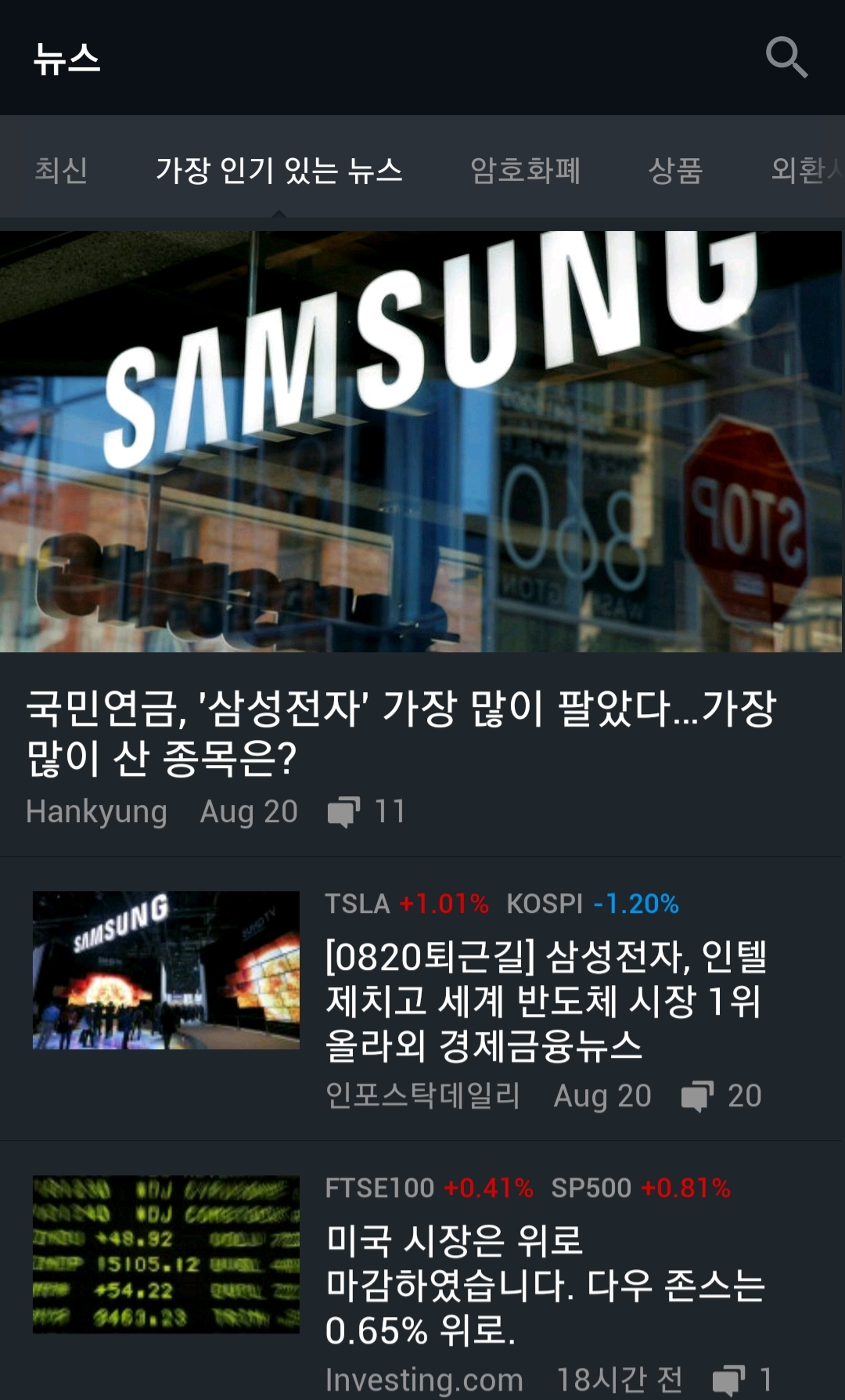 투자자라면 필수로 갖고있어야할 어플이라고해도 과언이 아닙니다. 주식 포스팅을 보다보면 이런 이미지를 종종 보게되는데, 바로 이것이 인베스팅 닷컴입니다. 인베스팅 닷컴이 좋은 이유는 경제와 관련된 정보를 한눈에 살펴볼 수 있다는 점입니다. 이 사이트 저 사이트 왔다갔다 유목민생활을 청산할 수 있다는건 꽤나 큰 장점입니다. 처음에 주식입성했을 때 포털사이트 경제면 뉴스기사를 주로 봤었는데, 아무래도 주식과 관련없는 기사도 많아 불편했습니다. 주식 기사들만 액기스로 볼 수 있다는 것이 정말 좋습니다.