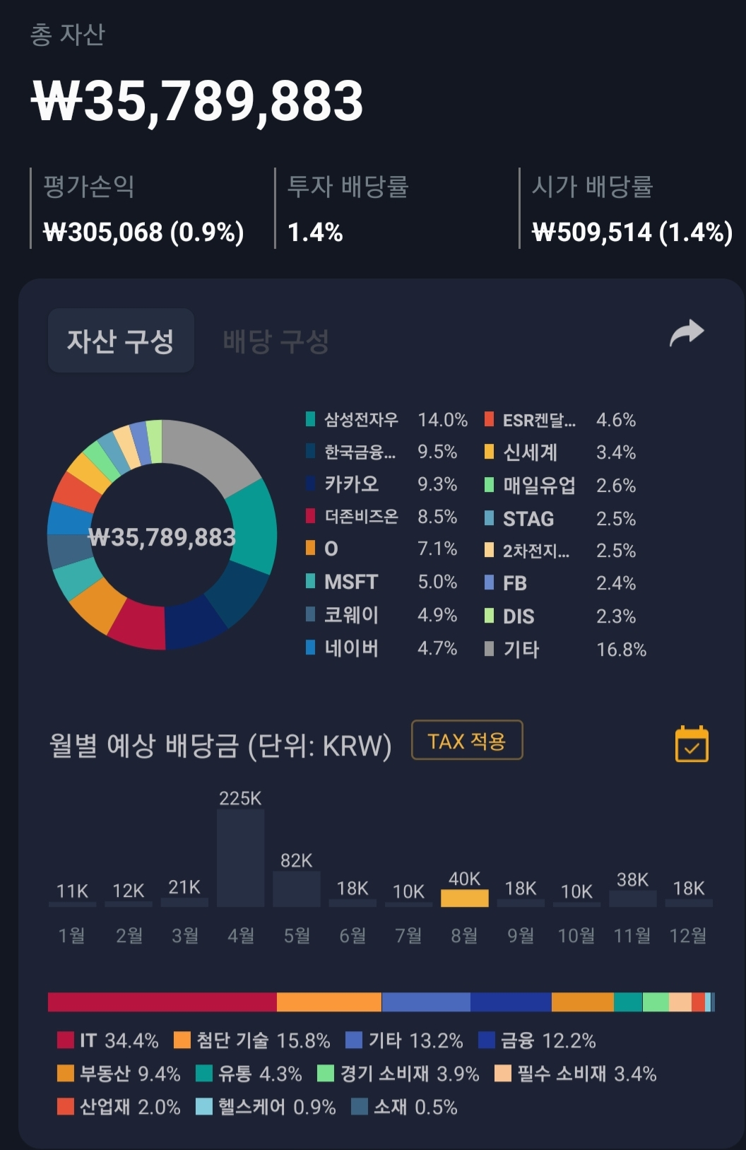 배당주에 관심이 많으시다면, 필수적으로 하셔야할 어플입니다. 주식 웬만큼 하신다는 블로거들 글에보면 꼭 하나씩 있는 어플 화면입니다. 증권사별로 흩어져있는 주식들을 한번에 확인할 수 있다는 것이 강점입니다. 내 포트폴리오 자산 비중을 알 수 있을 뿐만아니라, 이를 통해 매달 배당금을 얼마나 받을 수 있는지 확인할 수 있습니다.