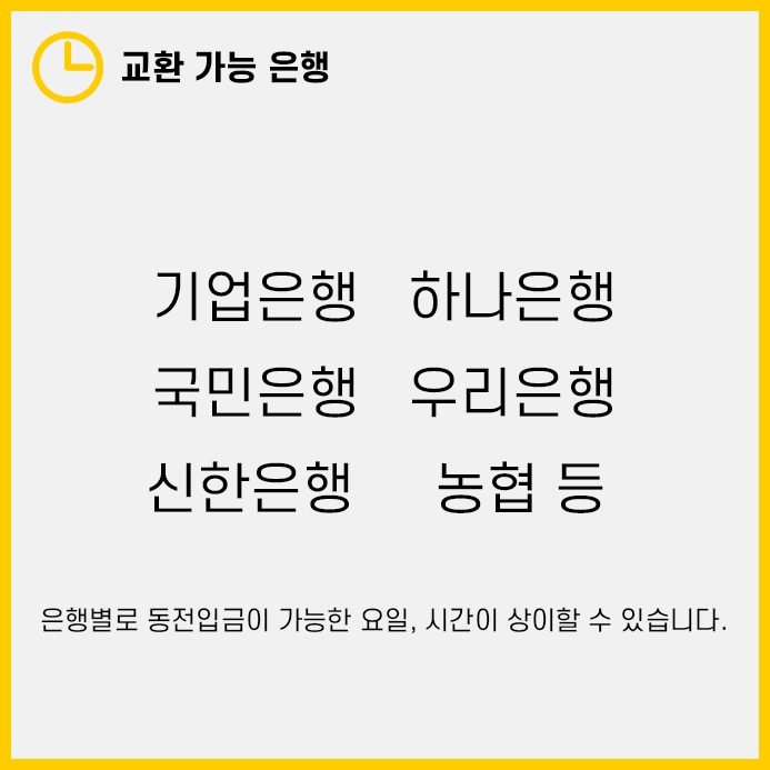 그래서 지점을 방문하기 전에 유선상으로 문의를 하는 것을 추천드립니다. 전화로 동전교환 요일 및 시간, 준비물 등을 체크해야 헛걸음 할 일이 없겠습니다.