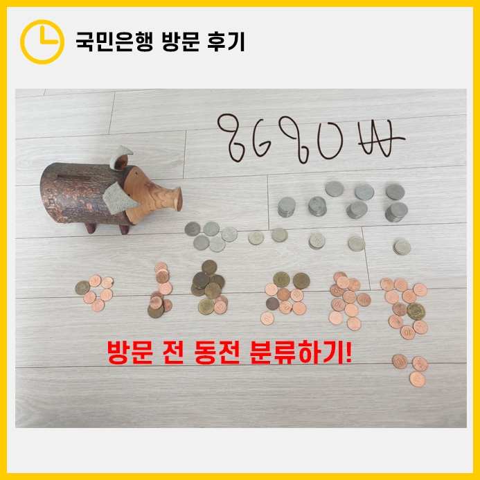 그러다보니 돼지저금통에 더이상 동전을 저금하지 않게되더라고요. 그래서 오늘은 그동안 집에 잠들고 있던 동전들을 모아 교환을 위해 국민은행에 방문했습니다.