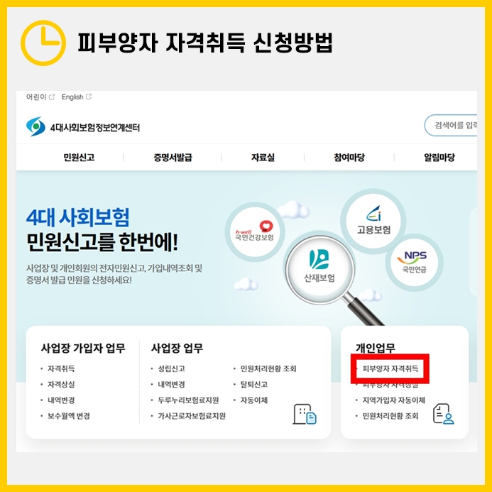 피부양자로 들어가기 위해서는 해당 홈페이지에 접속해 [개인업무] - [피부양자 자격취득]을 선택합니다.