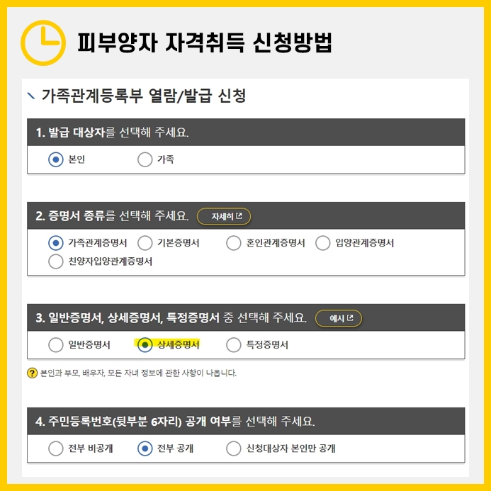 가족관계 증명서를 발급할 때 3번에서 반드시 '상세증명서'를 선택하도록 합니다.