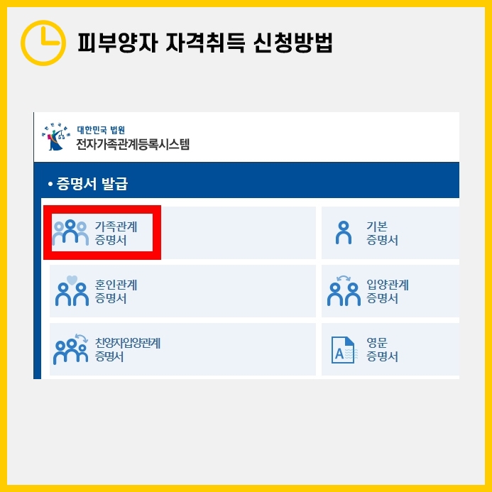 이렇게 피부양자 자격취득신고서 기본정보 작성이 완료되었다면 서류를 첨부해야합니다. 이 때 필수적으로 요구되는 서류는 가족관계 증명서입니다.
