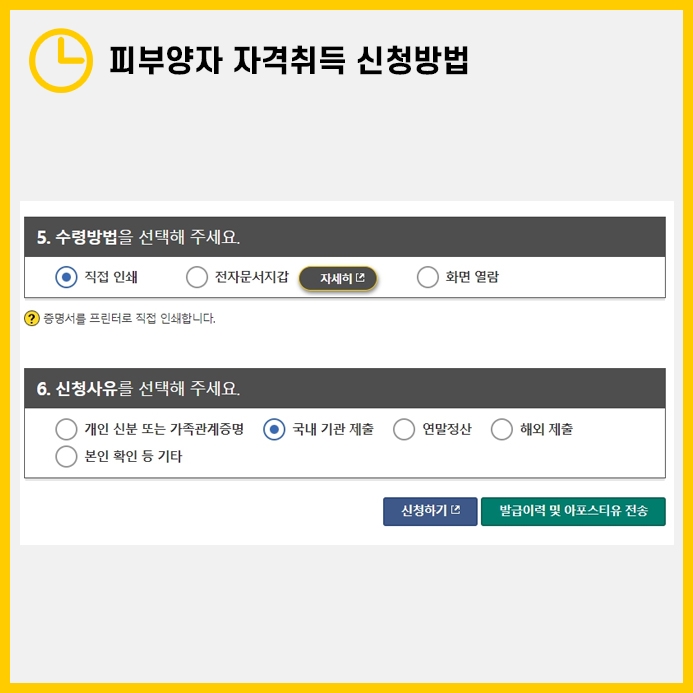 그 다음 5번에서 '직접인쇄'를 선택하고, 6번에서는 '국내 기관 제출'에 체크합니다.
