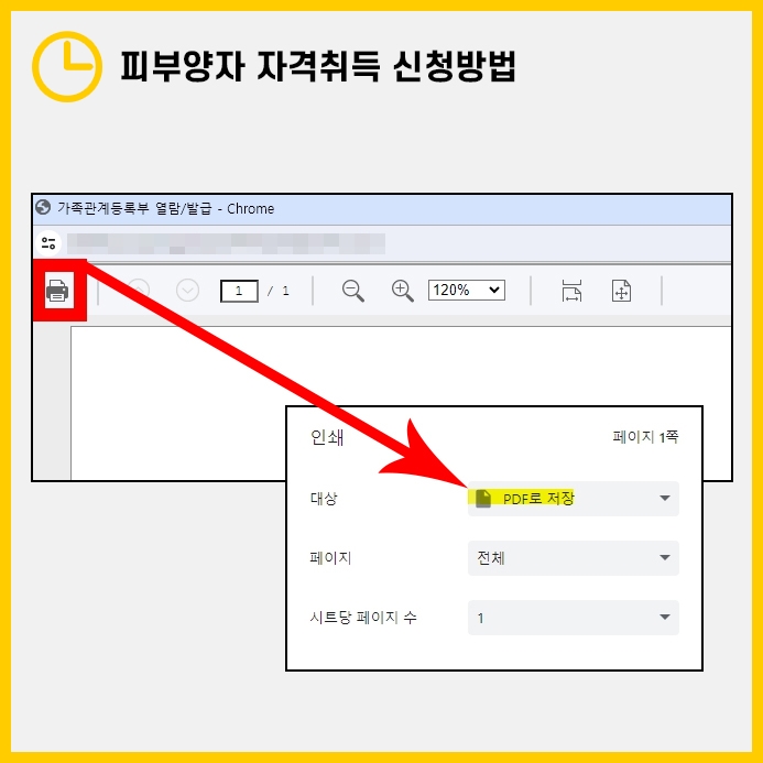 이제 정상적으로 가족관계 증명서 발급이 완료되었습니다. 인쇄버튼을 누르고 대상에서 'PDF로 저장'을 선택합니다.