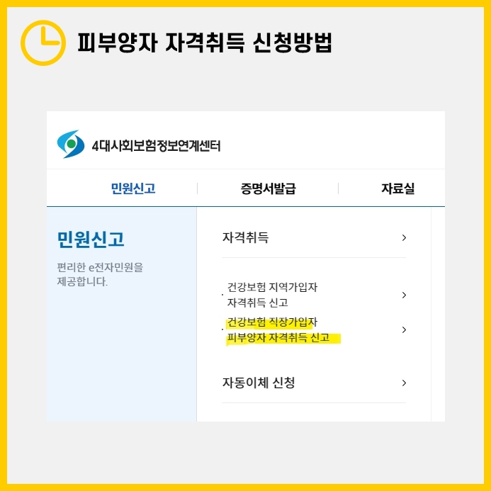 메뉴에서 [민원신고] - [자격취득] - [직장가입자 피부양자 자격취득 신고]를 선택합니다.