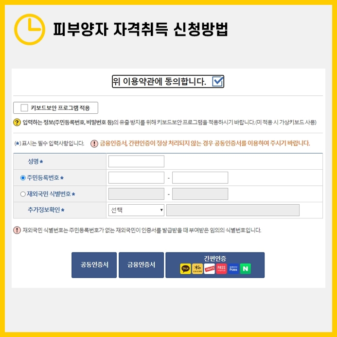 각종 약관에 동의한 뒤 성명, 주민등록번호 등의 정보를 입력합니다. 정보기입이 완료되었다면 본인인증까지 완료합니다.