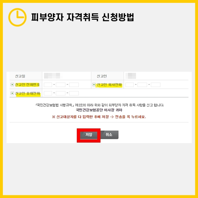피부양자 자격취득신고서 하단에는 신고인의 전화번호, 휴대폰, 회사연락처를 기입해줍니다. 작성이 완료되었다면 '저장'을 클릭합니다.